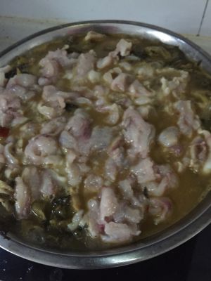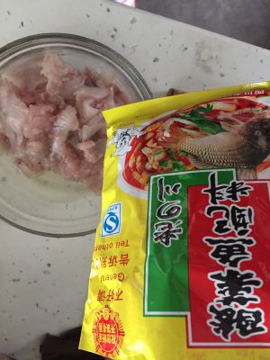 黑鱼市场买回来。已经帮忙杀好片好了。如果你那没有这个服务。就自己动手哈 先用腌鱼料把鱼片腌制上 热锅冷油 放入酸菜包 炒出香味。油多点 酸菜吸油