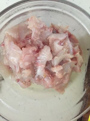 鱼切片,冷水浸泡,撒盐,清洗。直到鱼片和水都变透明。沥干水分