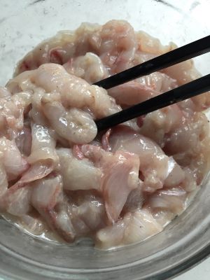 切好后水洗掉黏液,用盐,淀粉,料酒腌制20分钟。