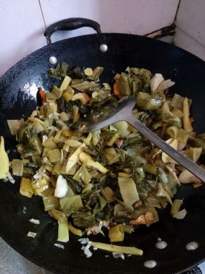 放入适量的油,温热后,加入酸菜炒出香味