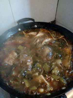 把煮好的酸菜鱼放在粉条上面