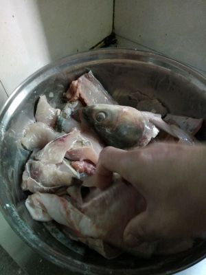 洗净切片,将鱼头和鱼骨鱼尾放一起盐,料酒,生姜一片,调料包(生粉)腌制10分钟