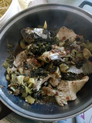 鱼骨熟了,把酸菜及鱼骨用漏勺舀到汤锅里~