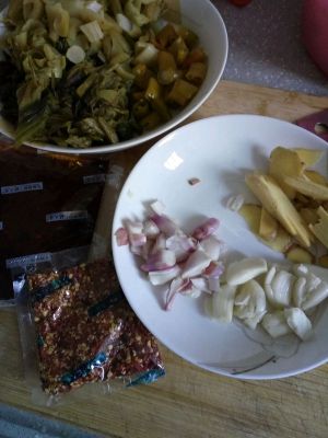 把酸菜及泡椒放水浸泡,葱姜蒜及买来的酸菜鱼调料包准备好~