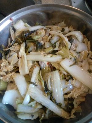 酸菜是包里切好的,如果买的整颗自行改刀。佐料差不多了酸菜就可以入锅了,翻炒后盛出备用