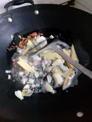 葱姜蒜及少许干红椒,两个八角,少许花椒,放花生油烧热,爆香调料~