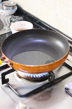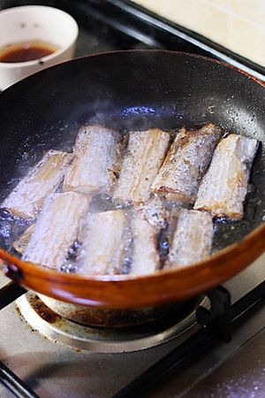 带鱼解冻后,用剪刀清理内脏,再切成小段,平底锅内放老茶油,把带鱼段炸香。