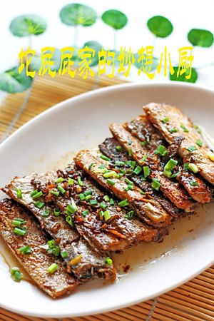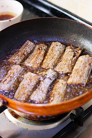 待糖水快收汁倒入一点香醋入锅,再加入一点白开水煮一煮带鱼,收汁前再加入点姜丝。