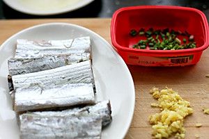 加入姜丝蒜片、1勺料酒、1勺生抽、3克胡椒粉,用手揉搓,方便带鱼腌制入味
