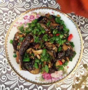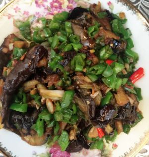 锅里留少油,把大蒜下锅煸香,大蒜至金黄后下茄子翻炒两下,下盐少许,白糖,酱油(配料根据个人口味添加多少)炒匀后下青椒圈,青椒刚一变色加鸡精就可出锅啦