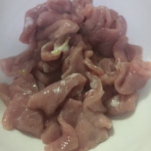 里脊肉切片,比一元硬币稍厚点,加入一个蛋清,少量盐,少量鸡精腌制一会儿