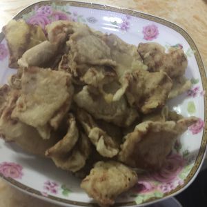 把猪肉切片,加淀粉和面粉炸至金黄(可以加鸡蛋,但是我爸对蛋黄过敏,所以我没加)