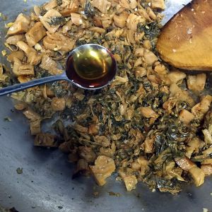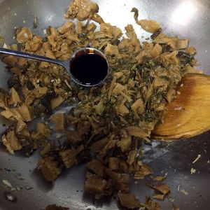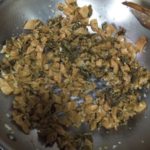 倒入梅菜煸炒一下,加入料酒,酱油,蚝油,白糖翻炒均匀,加入一勺高汤煮五分钟。把姜蒜挑出不要。