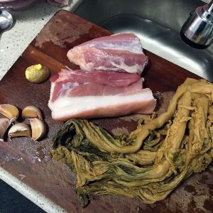 梅菜提前泡一晚洗干净,蒜头5个,薑一小块。