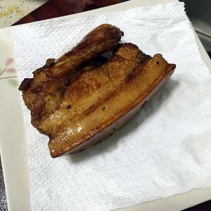 炸好的五花肉捞出来,稍微放凉切厚片。