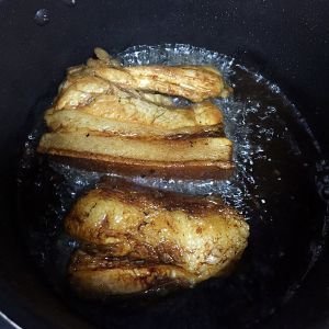 另拿一锅装半锅凉水,将炸好的扣肉捞起来马上放进凉水里,待水变凉后把锅和扣肉一起置于火上烧开五分钟后,把扣肉捞起,沥干水分。