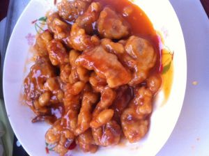 接着把油倒出留底油,开火,把洋葱爆香之后倒入事先配好的酱汁,煮开,煮到稠之后倒入炸好的肉收汁,完成!