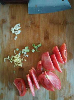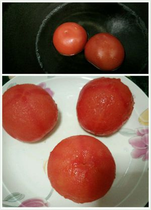 烧热水把番茄煮一会儿(可以很容易的把皮撕下来),然后番茄切成小丁状,放盘备用