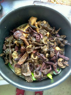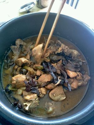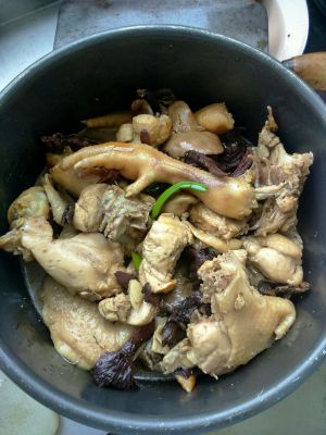 把鸡肉和各种材料倒入高压锅中。把泡好的蘑菇水倒入鸡中,蘑菇也放入鸡肉中。蘑菇是好朋友的爸爸在山上采的,给我寄过来的。特别清香。