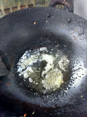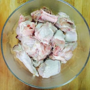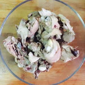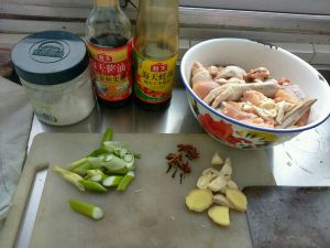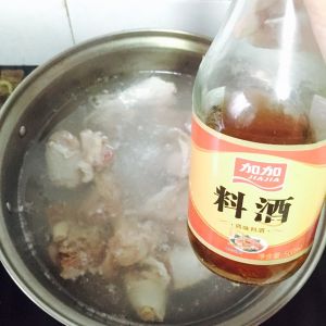 准备一只2斤左右的小公鸡。斩成小块。冷水下锅焯水。水里放些料酒去除腥味儿。(我放的是黄酒。)焯好后的鸡块用清水洗干净备用。