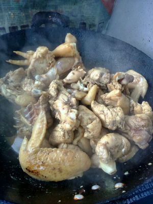 把鸡肉翻炒一会,把葱姜蒜八角等入锅,倒入生抽老抽蚝油翻炒鸡肉到三四成熟。