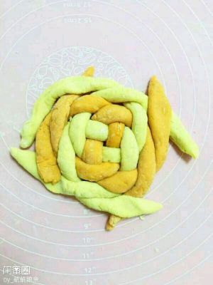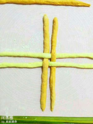 把两种面团,分别揉成细条。分成四分,按两色一上一下,搭成十字架。