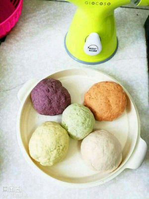 剩下的各色面团,都按同上方法揉捻成圆形彩色面球。