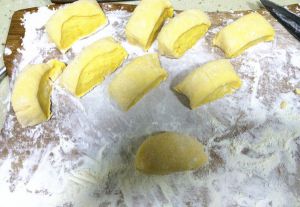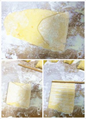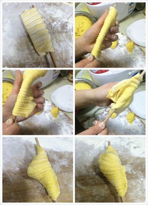 筷子从面片的下面穿过,用手拉长面团,借势一扭,然后抽出筷子,面团就像海螺一样啦!^_^