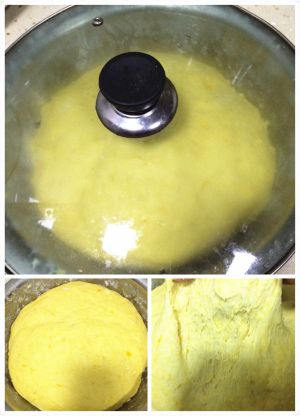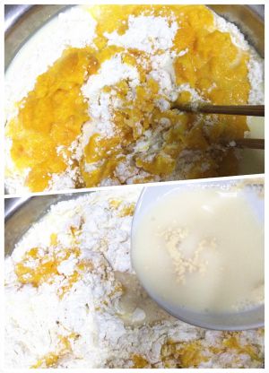 将南瓜泥倒入面粉中,然后加入温水调好的酵母水,开始和面。(因蒸好的南瓜很湿润了,所以和面的时候,就不需要另外加水啦!)