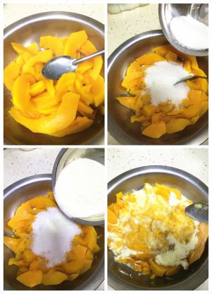 南瓜蒸好出锅后,趁热加入白砂糖、奶粉压成泥备用。