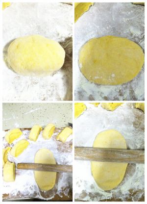 将小面团继续揉至光滑,在案板上搓一下,成扁平的形状,擀成长面片;