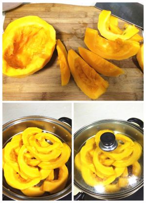 将南瓜去皮、切块、上蒸锅大火蒸20分钟。