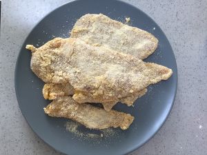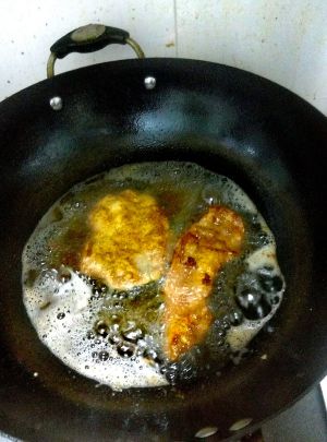 把腌制好的鸡胸脯沾上面包糠放入油锅中炸至金黄色