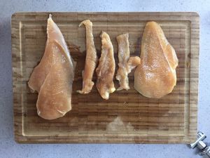 将鸡胸肉去筋、膜,用肉锤均匀敲松至一倍大