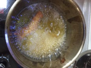 裹好炸鸡粉下锅油炸5-6分钟直到鸡肉熟透。