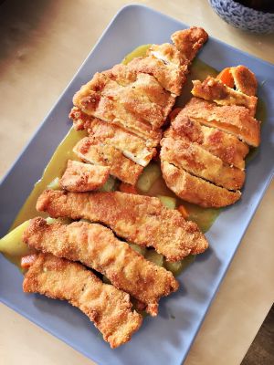 摆盘,酱咖喱汁铺底或者淋在鸡排上皆可