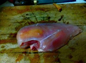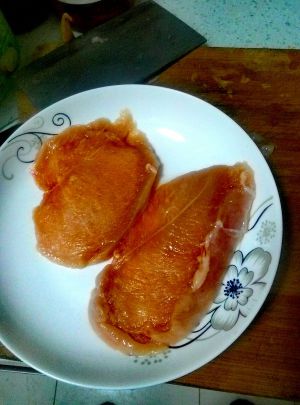 做完了才想起没拍图…给大家说说吧…买好的鸡胸脯片成薄片,先腌制一下…放入料酒,葱,姜,盐,胡椒粉,腌制10分钟…