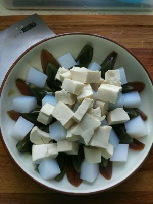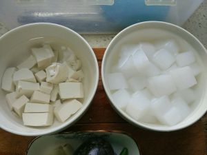 两种豆腐分别切骰子块,用开水烫一下,去掉豆腥味