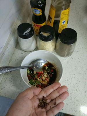 锅里烧热油,丢点花椒进去炸香,碗里放胡椒、鸡精、香醋、生抽、