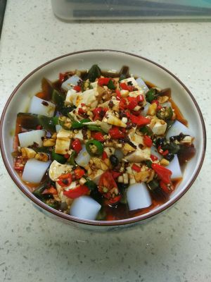 将内脂豆腐切1厘米的厚片移入盘子里,放上切好的皮蛋粒,淋上碗汁,再来几个小米辣椒圈点缀,就好了!