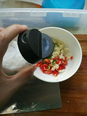 小米椒和蒜瓣剁碎用盐腌渍出辣味~