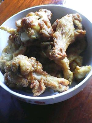 裹好炸鸡粉下锅油炸5-6分钟直到鸡肉熟透。