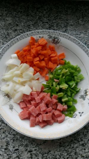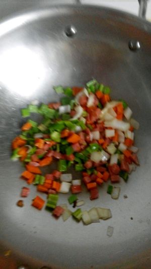 配料倒入锅中炒至七分熟倒入炒好的馒头,加少许盐,胡椒粉。