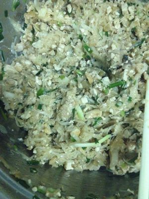 把五花肉,豆腐干,榨菜,葱花,白萝卜,放调料,挍伴均匀,备用