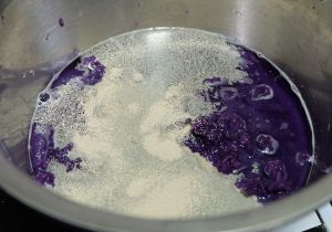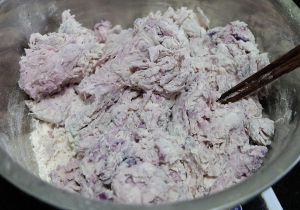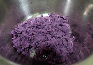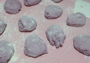 温水加入孝母,白糖熔化,到入面粉揉成一团,分一半加入碾碎紫薯揉均匀,