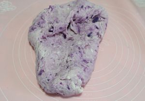 将面团移到揉面垫上,开始揉,这个时候还能看到紫薯的碎块,没关系,揉着揉着就会融合在一起了;