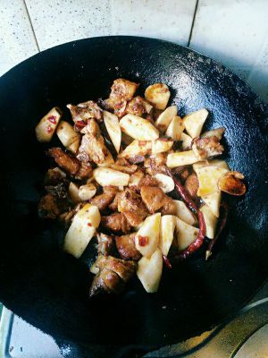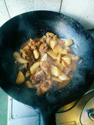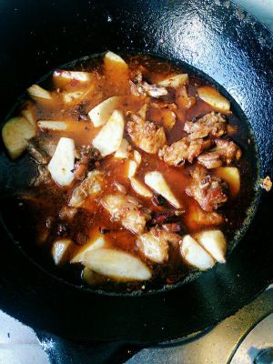 把煮好的排骨捞出,锅热油,放入白糖,等白糖化了(起沫),把排骨导入,翻均匀使其完全上色,放入花椒,八角,翻炒一会闻到花椒的香味,倒入土豆,添水到锅里总量的一半,放入盐,中火顿28分钟,把辅料倒入,大火翻炒。