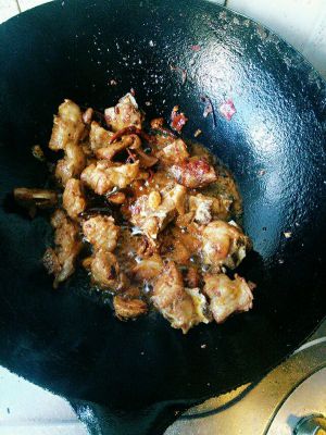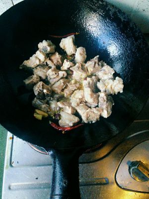 3-5秒,配料发出香味,倒入排骨。翻炒3-5分钟