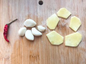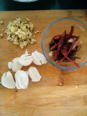 葱切段,蒜拍一下,姜切片,冰糖稍微拍拍颗粒小比较好炒