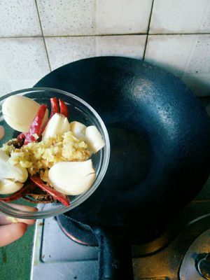 倒进生抽 老抽 翻炒 让排骨上色品时入味 这时把配料:桂皮 香叶 八角 蒜头